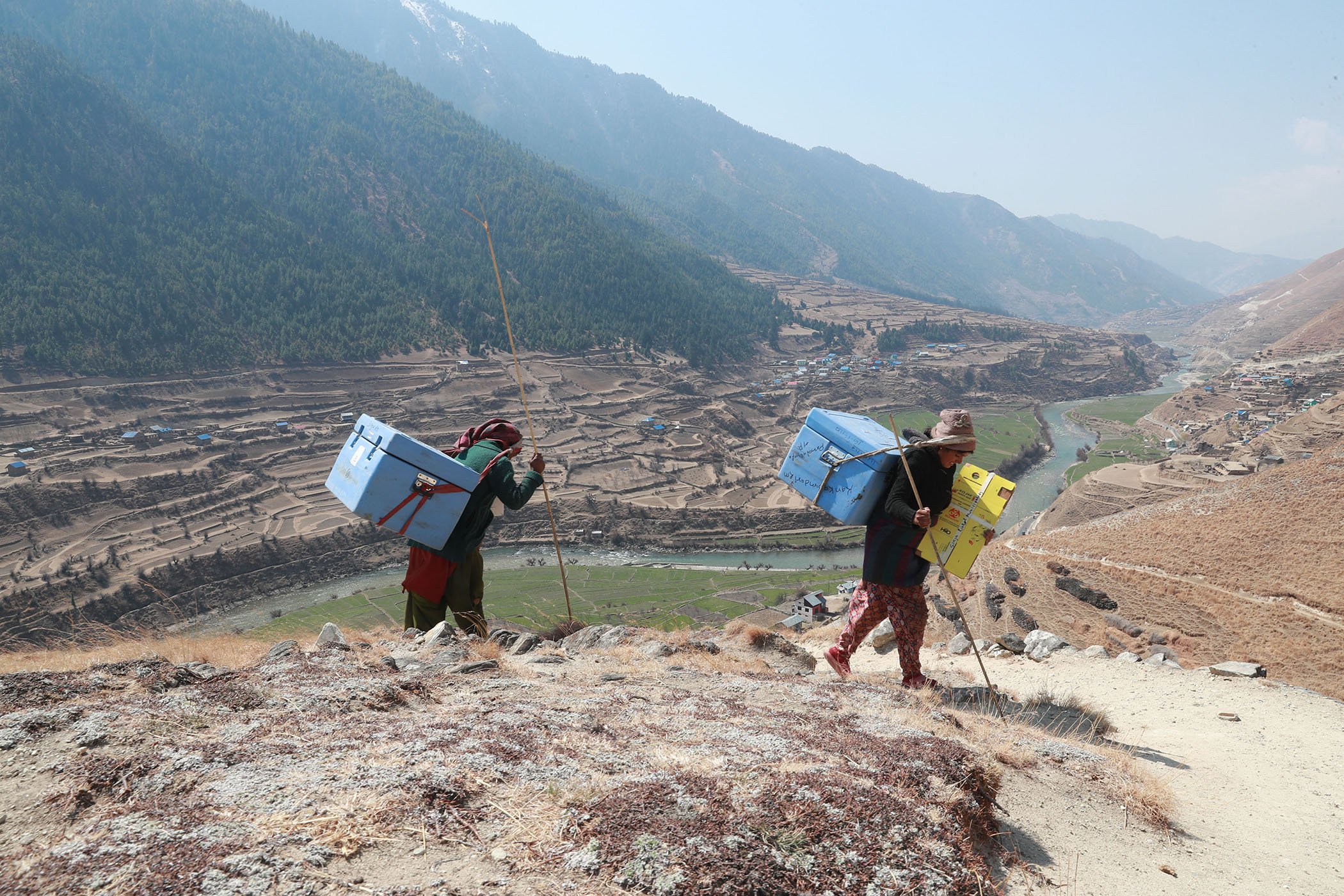 Porters carry COVID-19 vaccines to health facilities in Jumla District in Nepal’s remote far-west region on March 5, 2021.