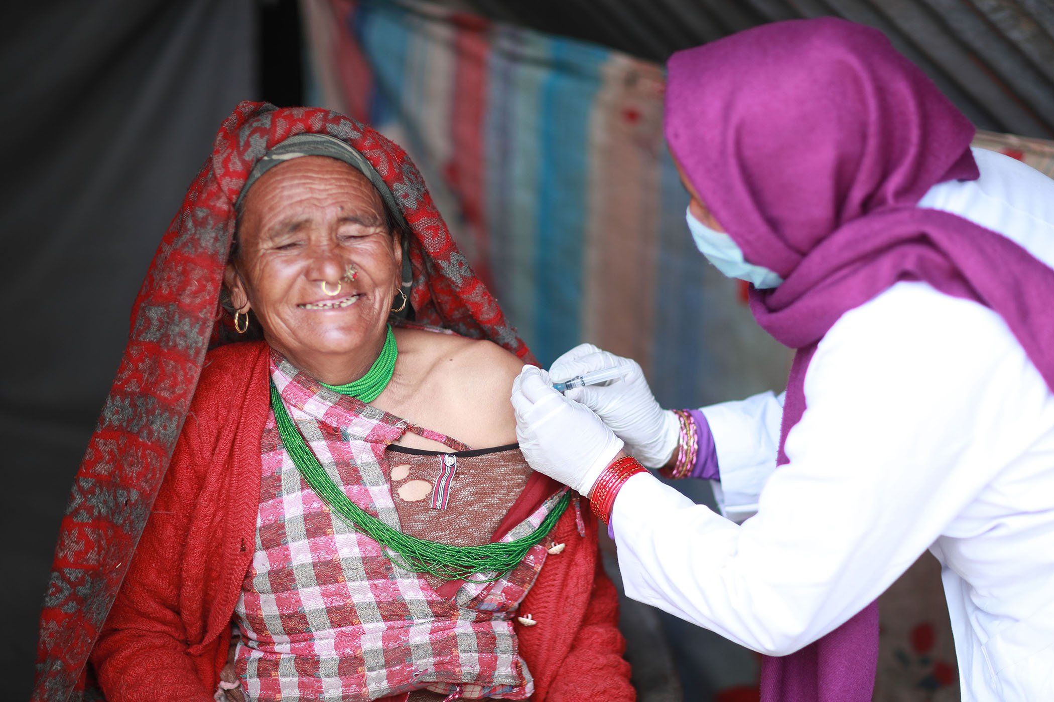 An elderly local resident of the remote Kankasundari area in Jumla District in Nepal, receives the COVID-19 vaccine at the hands of nurse Jandevi Budha at the Malikabota Health Post on March 7, 2021.