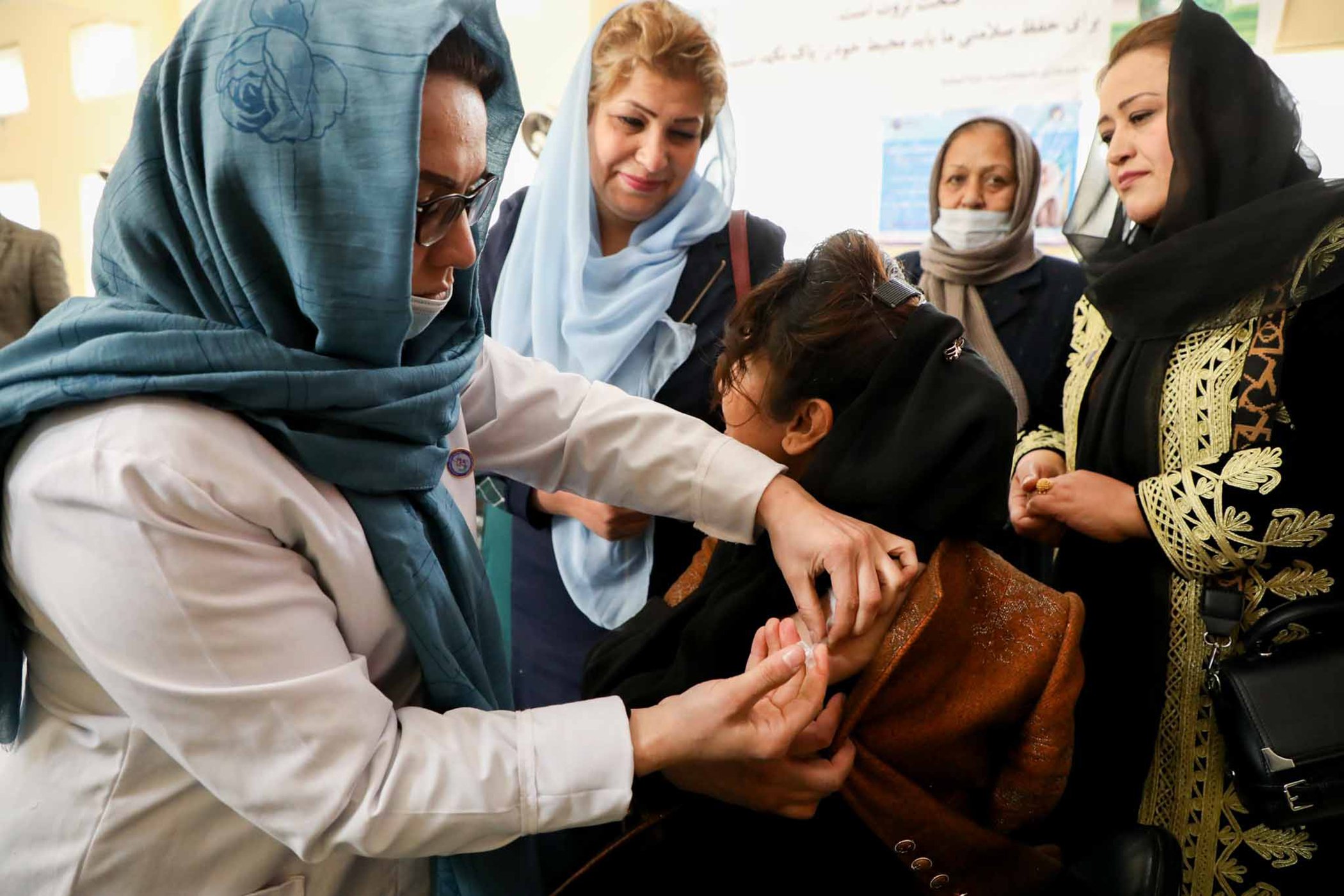 Aziza Barakzai recieves the COVID-19 vaccine facilitated by COVAX in Afghanistan, March 16, 2021. Barakzai is the head teacher at the Al-Fateh girls’ high school in Kabul and teachers in Afghanistan were eligible to receive the vaccine.