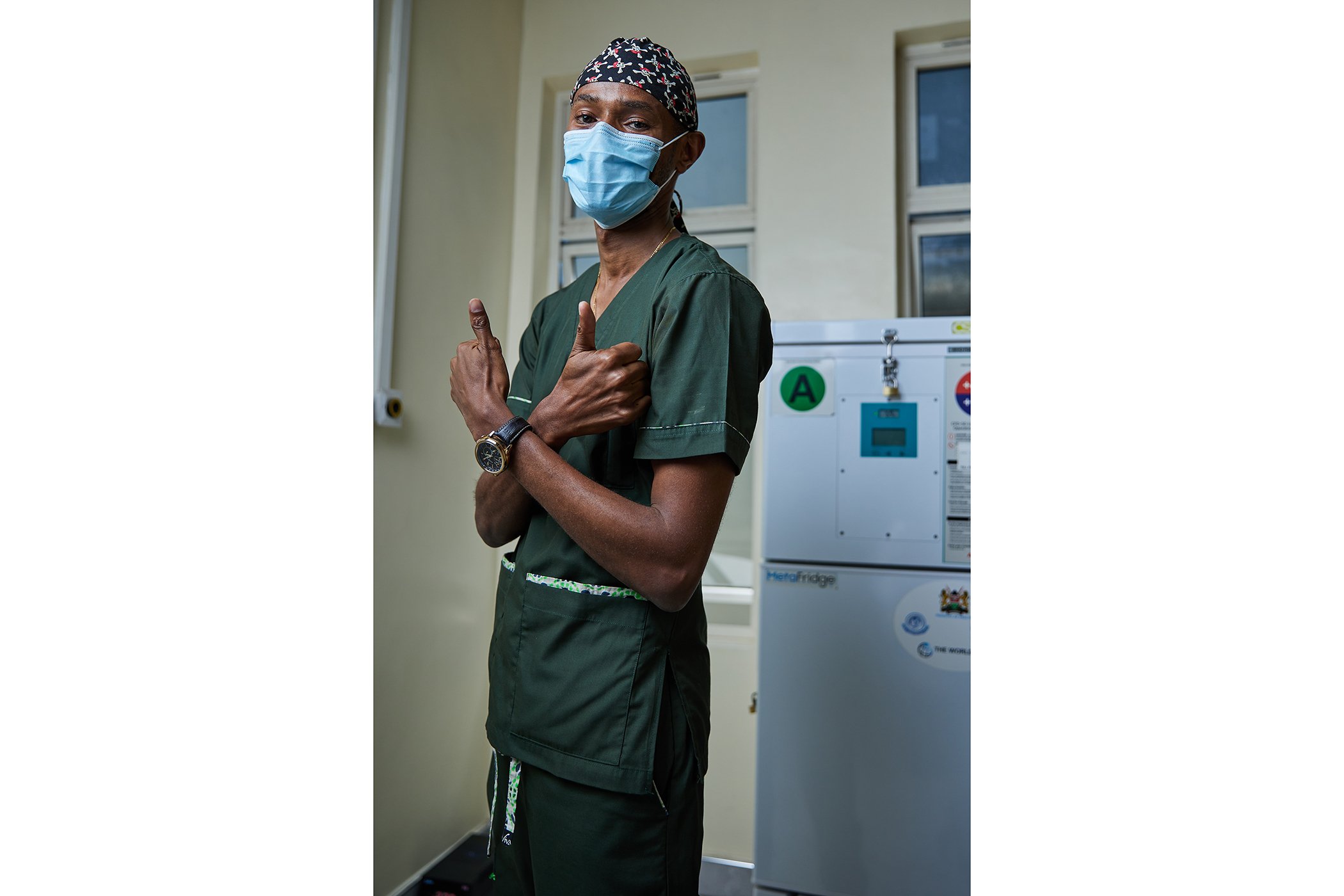 Dr. Eric Hungu, a surgeon at Kenyatta National Hospital, is seen after receiving the COVID-19 vaccine in Nairobi, Kenya on March 5, 2021. “This vaccine protects myself, my patients and my family form COVID-19. I am looking forward to the second dose.”