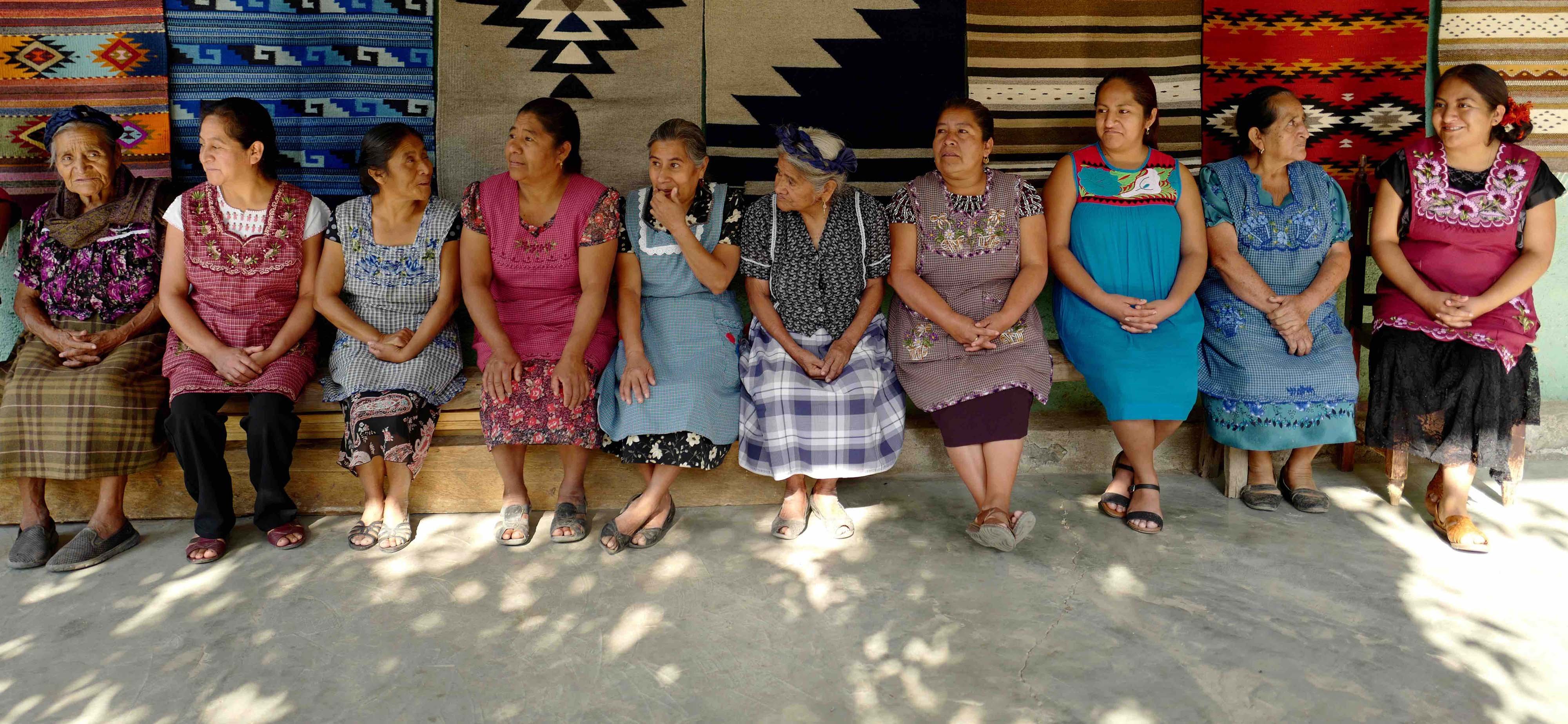 Women weavers of the “Vida Nueva” collective in Teotitlán del Valle, Oaxaca, Mexico, sit on a bench in front of their work.