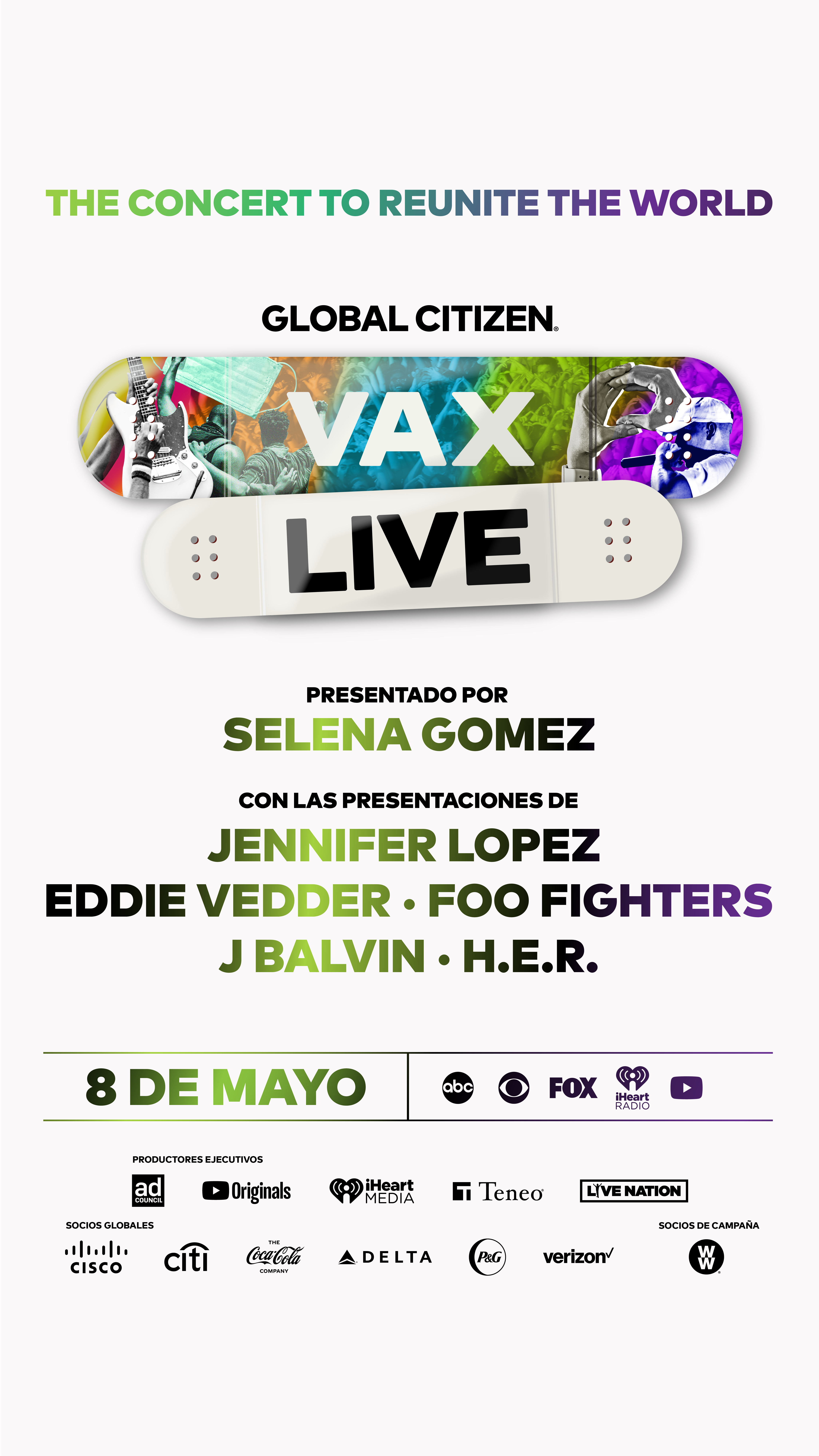 Para más información sobre VAX LIVE: The Concert to Reunite the World, visita globalcitizen.org/vaxlive y sigue a @glblctzn en Instagram, Twitter, Facebook y YouTube.