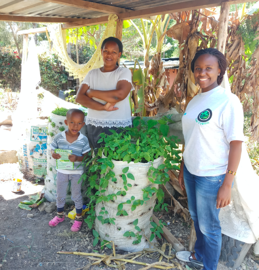 Después de que las mujeres asisten a los talleres de Muketha, les enseña sobre el cultivo de sacos, un tipo de cultivo altamente eficiente que permite a las mujeres aprovechar las pequeñas parcelas de espacio de jardín que están disponibles frente a sus hogares.
