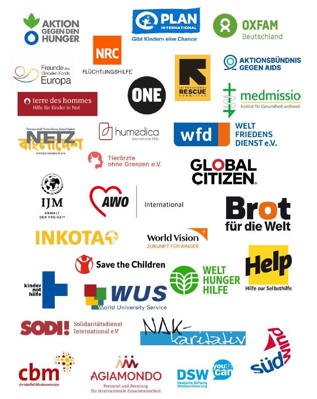 Agiamondo, Aktion gegen den Hunger, Aktionsbündnis gegen Aids, AWO International, Brot für die Welt, Christoffel-Blindenmission (cbm), Deutsche Stiftung Weltbevölkerung, Freunde des Globalen Fonds Europa, Global Citizen, Help – Hilfe zur Selbsthilfe, Humedica, Inkota, International Justice Mission (IJC), International Rescue Committee (IRC), Kindernothilfe, Medimissio, NAK-Karitativ, Netz Bangladesch, NRC Flüchtlingshilfe, ONE, Oxfam, Plan International, Save the Children, Solidaritätsdienst International, Südwind-Institut, Terre des Hommes, Tierärzte ohne Grenzen, Weltfriedensdienst, Welthungerhilfe, World University Service und World Vision.