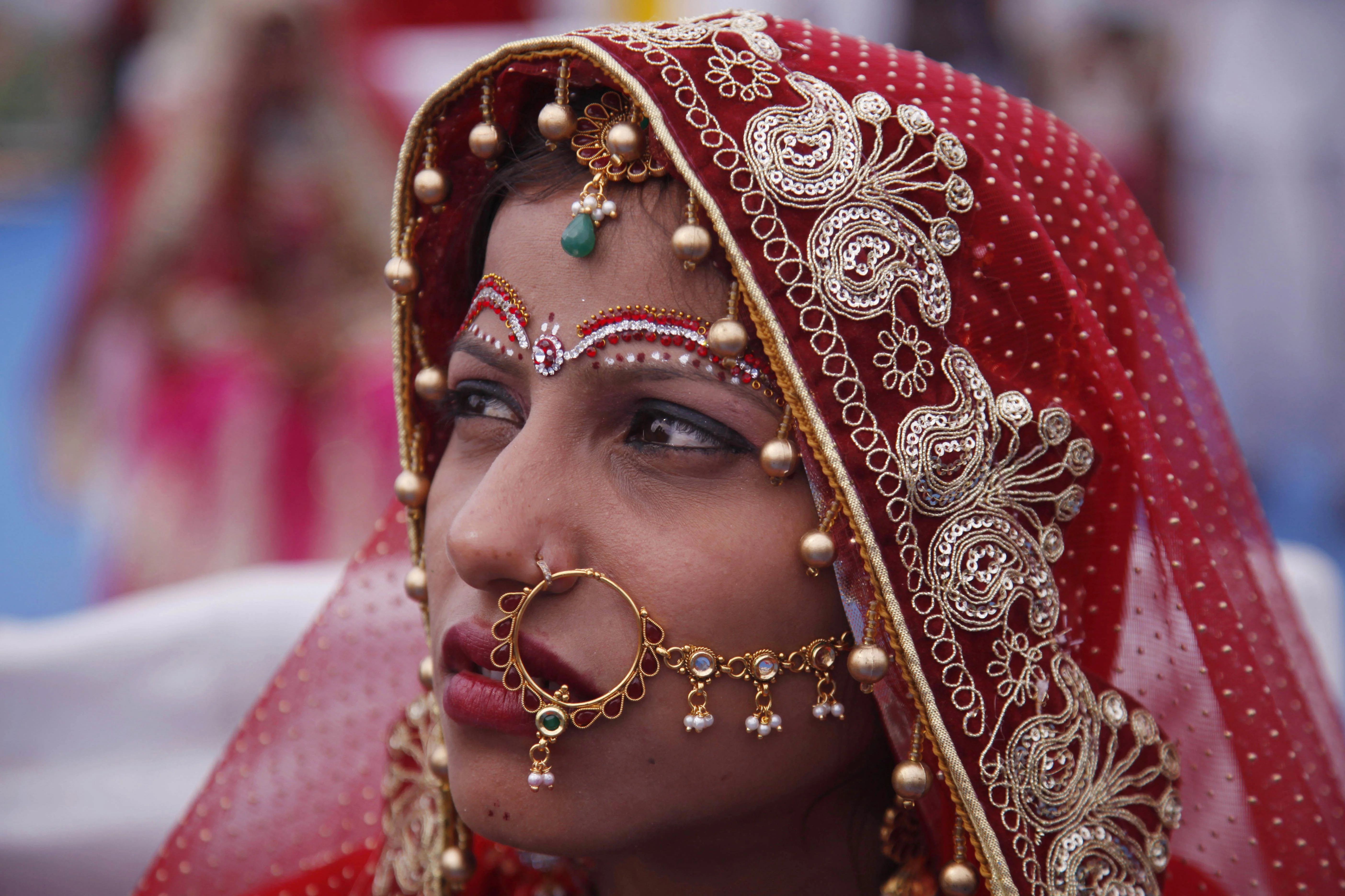 Bride during mass marriage in Ahmadabad, Gujarat state, India. Mass marriages often take place to help poor families pay for dowries.