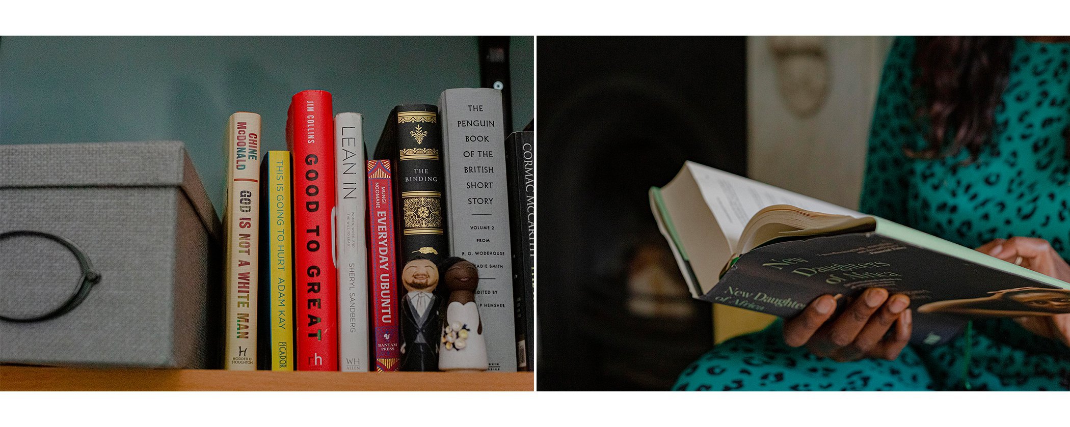 Le livre de Chine McDonald, « God Is Not a White Man & Other Revelations, » parmi d'autres livres sur une étagère de son domicile. Chine McDonald lit un exemplaire de « New Daughters of Africa : An International Anthology of Writing by Women of African Descent » de Margaret Busby.