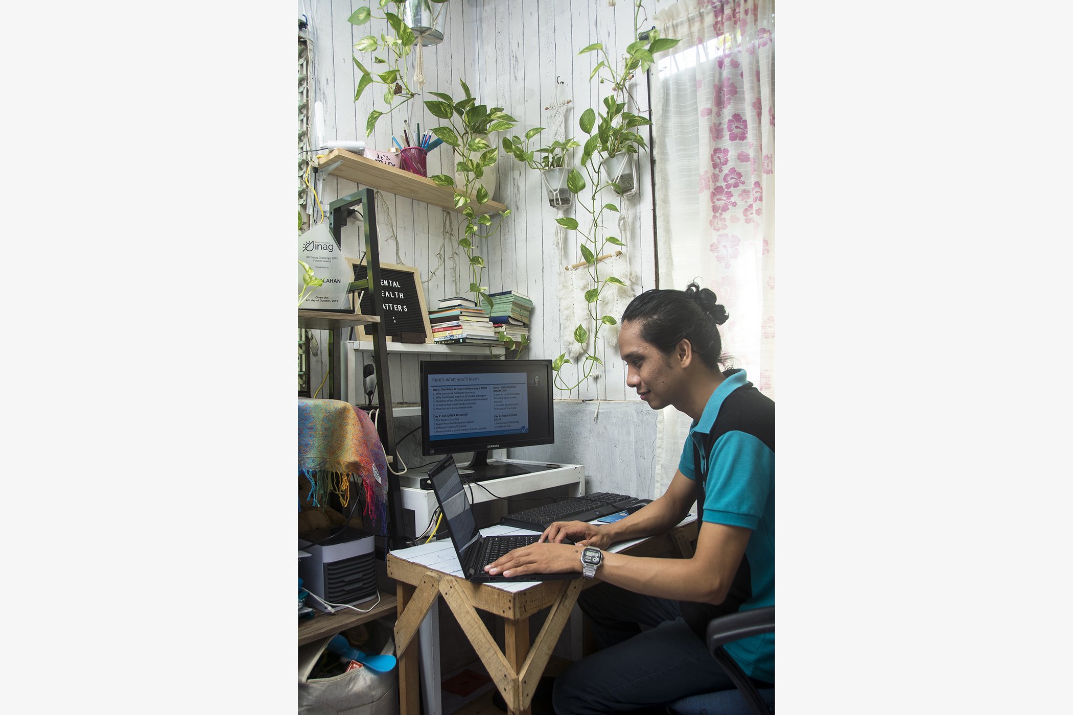 Ryan Gersava is pictured working on his computer at home in Davao City, Philippines. "I started Virtualahan because I was denied of employment after being diagnosed of an incurable disease that could have been prevented if I had access to vaccination as a