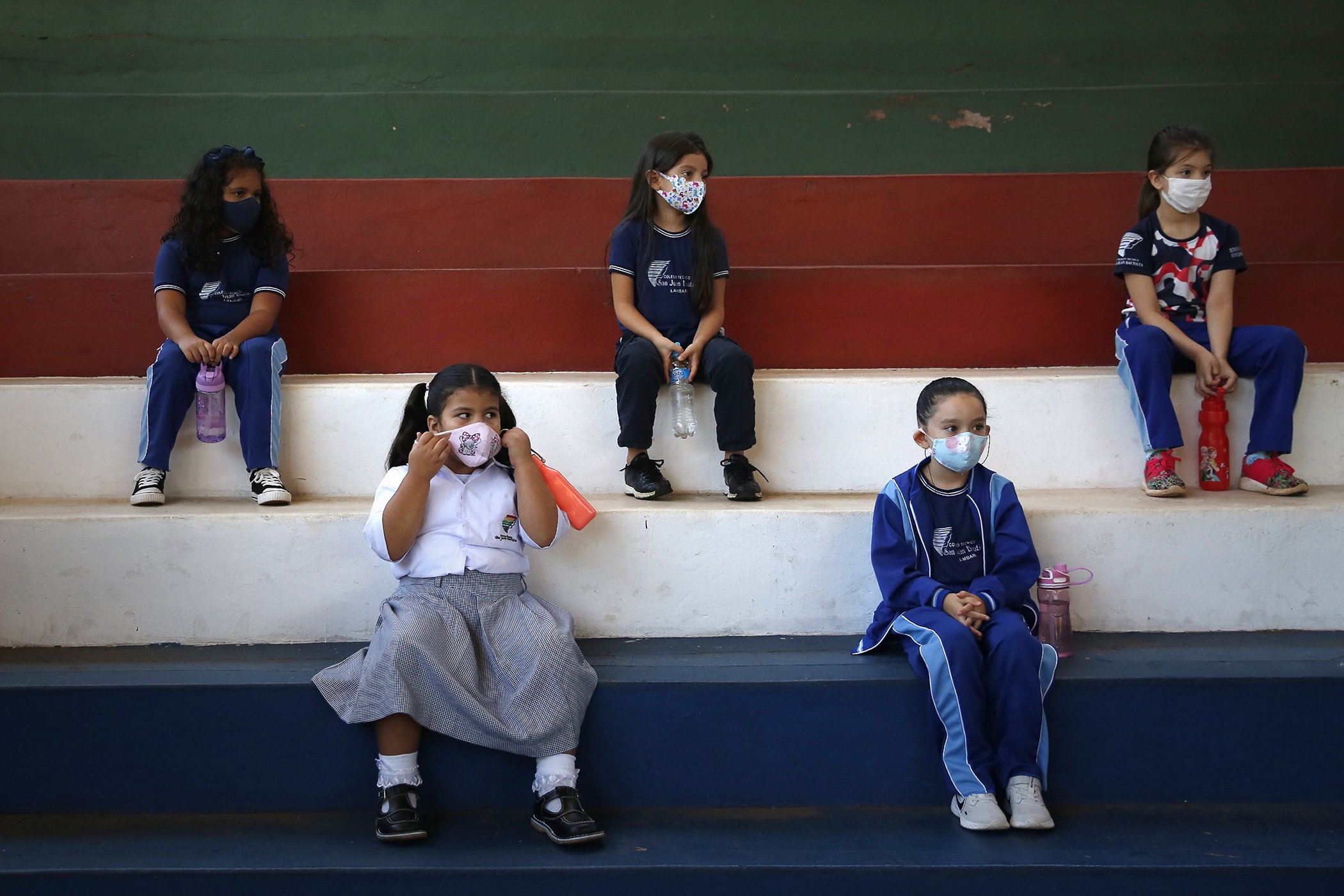 First-grade students wear masks and socially distance in the gym during class at San Juan Bautista technical school in Lambare, Paraguay, Feb. 17, 2021.