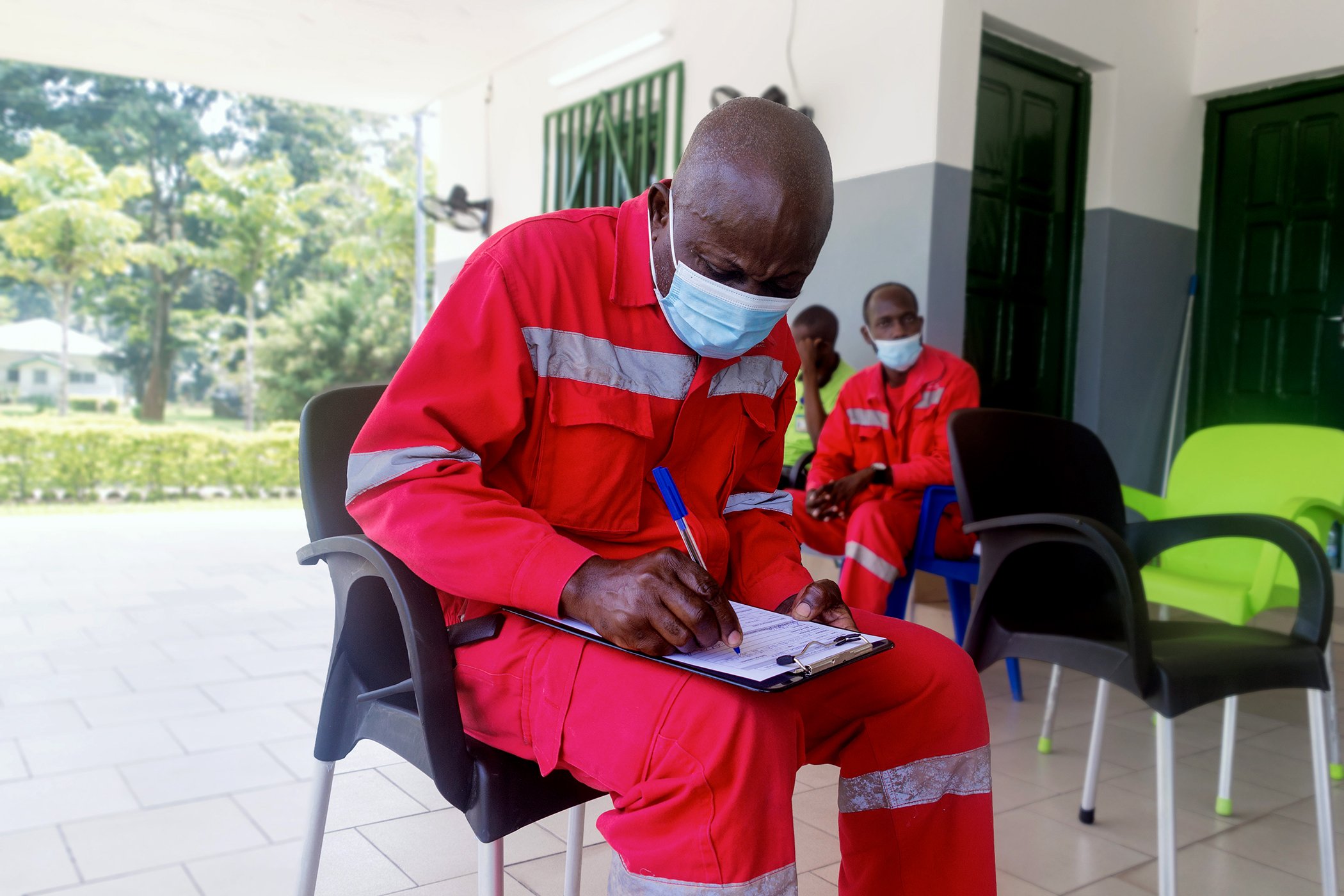 Miambanzila Joseph, who works for the fire brigade at the World Health Organization in Brazzaville, fills out his vaccination form before receiving the first dose of his COVID-19 vaccine in May 2021.