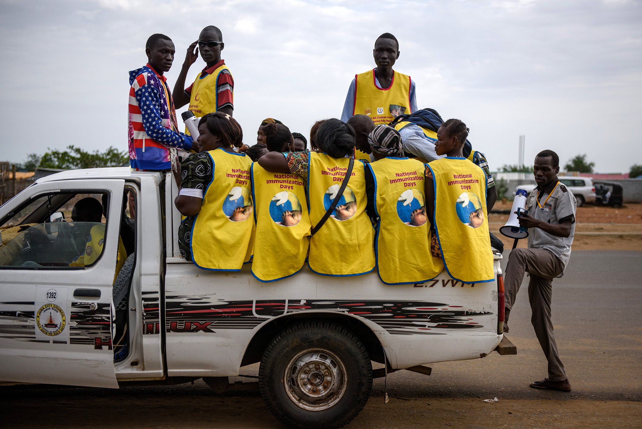 Vaccinators in Juba prepare to depart in a truck to administer vaccinations during the UNICEF-supported polio National Immunization Day (NIDs) campaign on March 29, 2017. In South Sudan in 2017, a National Immunization Day campaign against polio targeted over 3.7 million children under the age of 5 as part of efforts to ensure that the country remains polio-free and that immunization stays at the forefront of primary health care activities. No cases of wild poliovirus have been reported in the country since 2009.
