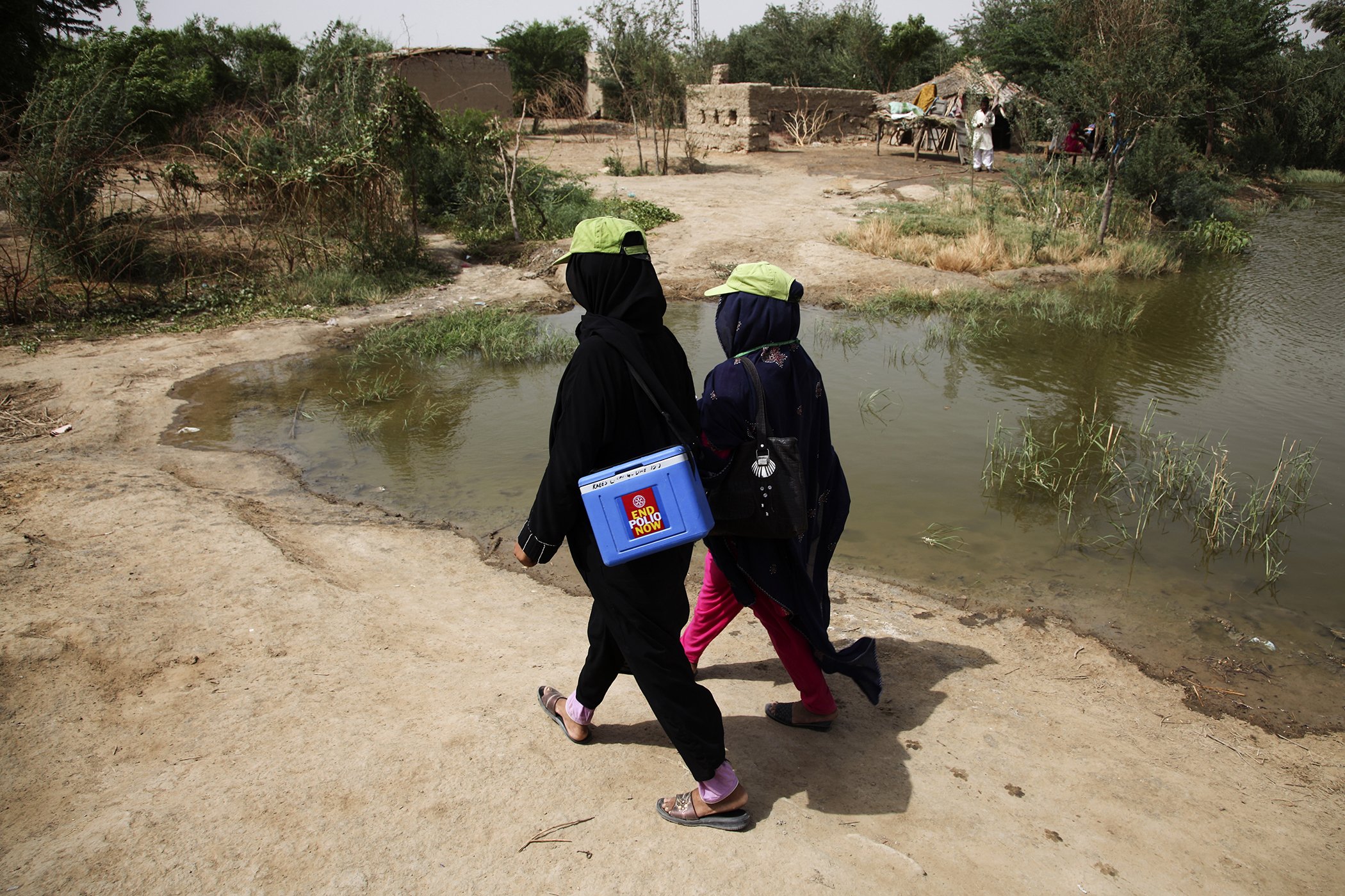 Health workers hold an insulated carrier filled with polio vaccines as they go door-to-door to immunize children, in Jamshoro District, in the south-eastern Sindh Province of Pakistan. Vaccine carriers play a critical role in preserving the temperature controls required to maintain vaccine potency from manufacture through inoculation. In December 2011, Pakistan had the world’s highest number of polio cases, and, of the three remaining polio-endemic countries, including Afghanistan and Nigeria, Pakistan is the only one in which incidents of poliovirus transmission are on the rise, thereby also threatening neighbouring countries and setting back global eradication of the disease.