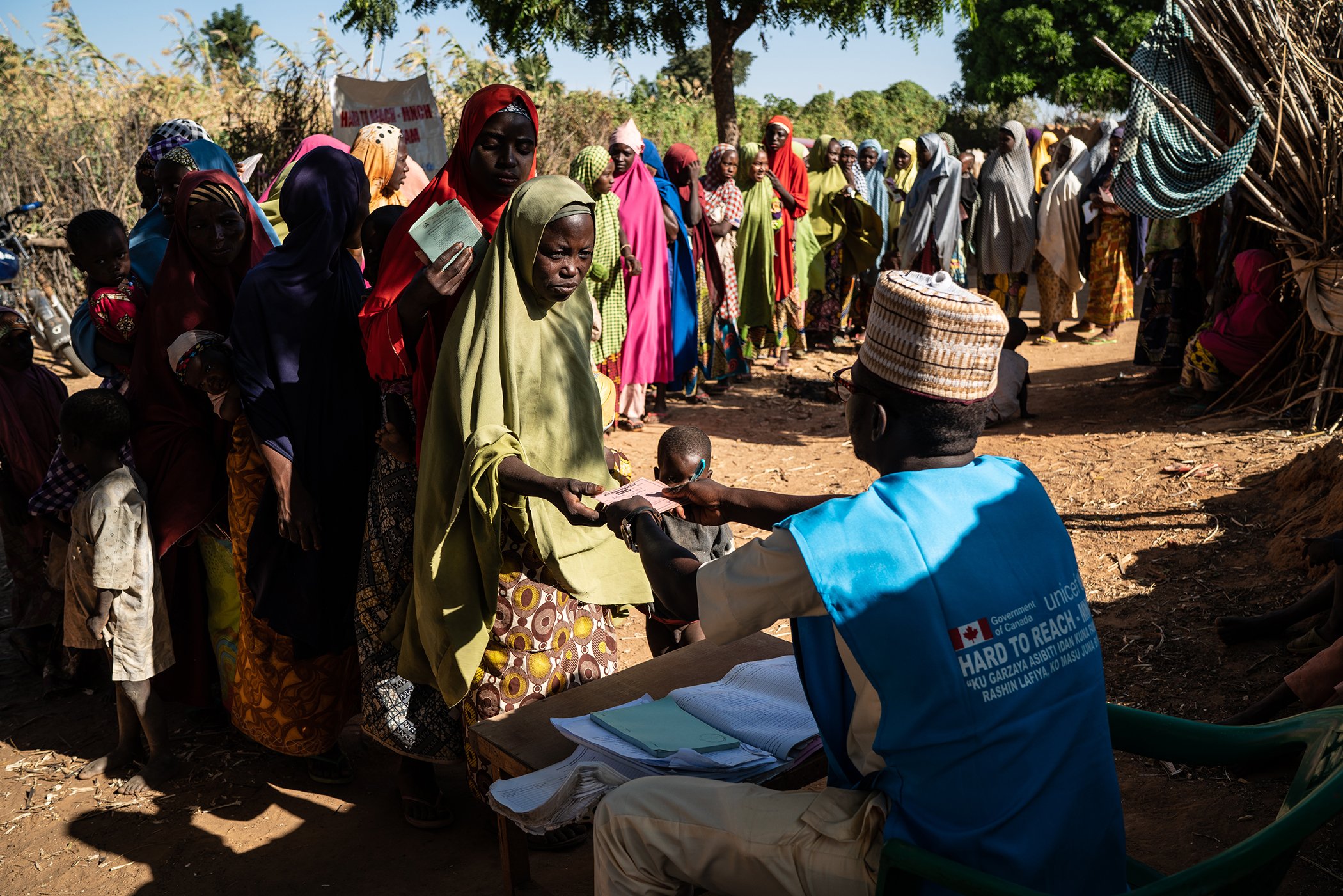 Mothers and their children cue in the registration line for UNICEF-supported mobile health clinic serving hard to reach places in Kawa Musawa, Zamfara State, Nigeria, on Nov. 12, 2018. Mobile health teams supported by UNICEF Nigeria, and funded by Global Affairs Canada, help to ensure that children receive polio vaccinations, whilst also providing basic health services, including medications to fight infections like ringworm, in hard-to-reach areas of Nigeria.