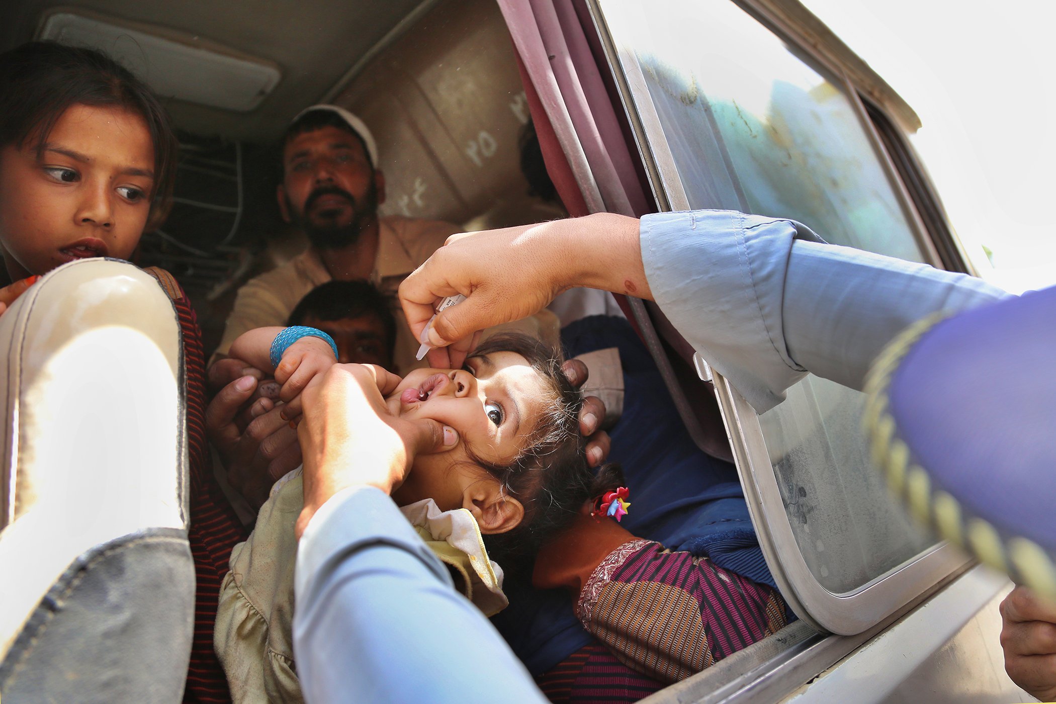 A girl is vaccinated for polio while on a bus in Torkham, Afghanistan near the Pakistan border in 2015. Several mobile teams of vaccinators are dispatched to the field in an outreach program during an extended nation-wide polio eradication effort.