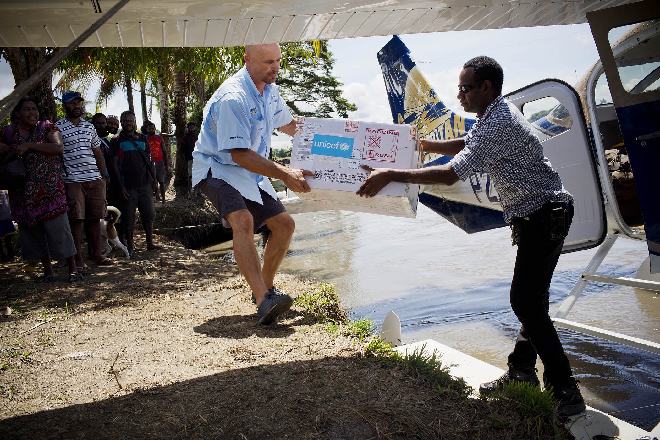 Polio vaccines are unloaded from a Samaritan Aviaton plane at a village that is inaccessible by road in East Sepik Province, Papua New Guinea on March 5, 2019. In the last year, 26 children contracted polio, leading to a country wide vaccination campaign supported by UNICEF and partners.