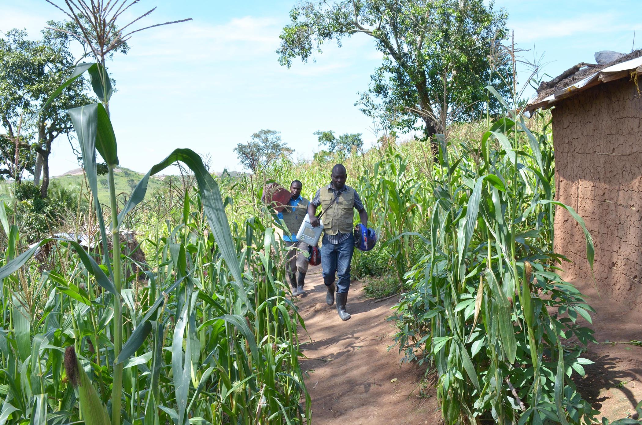 Health officials Francis Habyaremye and Andrew Isabirye arrive in Nyabwiso village after crossing through a swamp for an outreach vaccination session in May 2018.