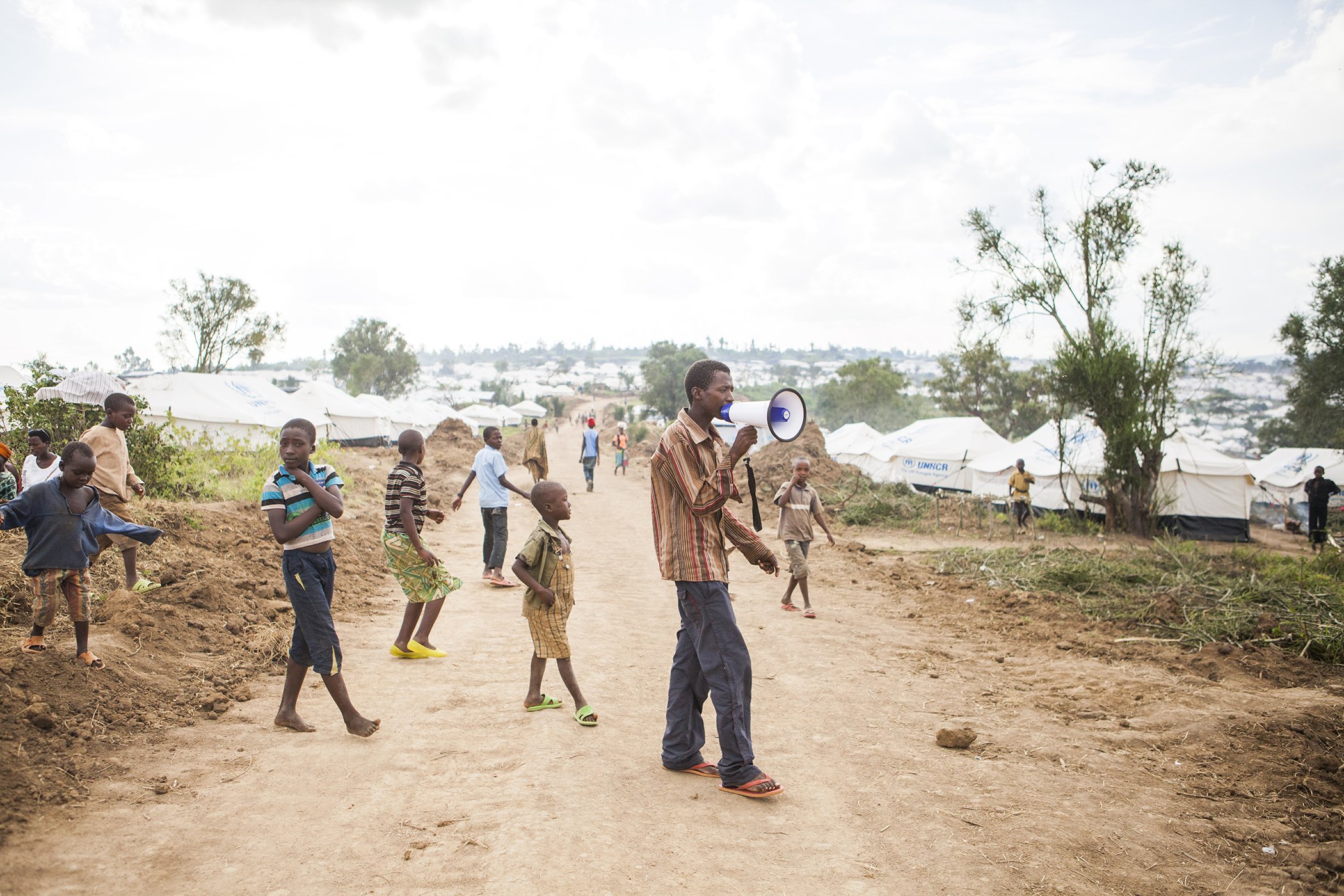 Anicet Ndayisenga, a volunteer community health worker, walks in a sector of Mahama refugee camp in eastern Rwanda, alerting families that polio and measles vaccinations are available for their children on May 25, 2015.