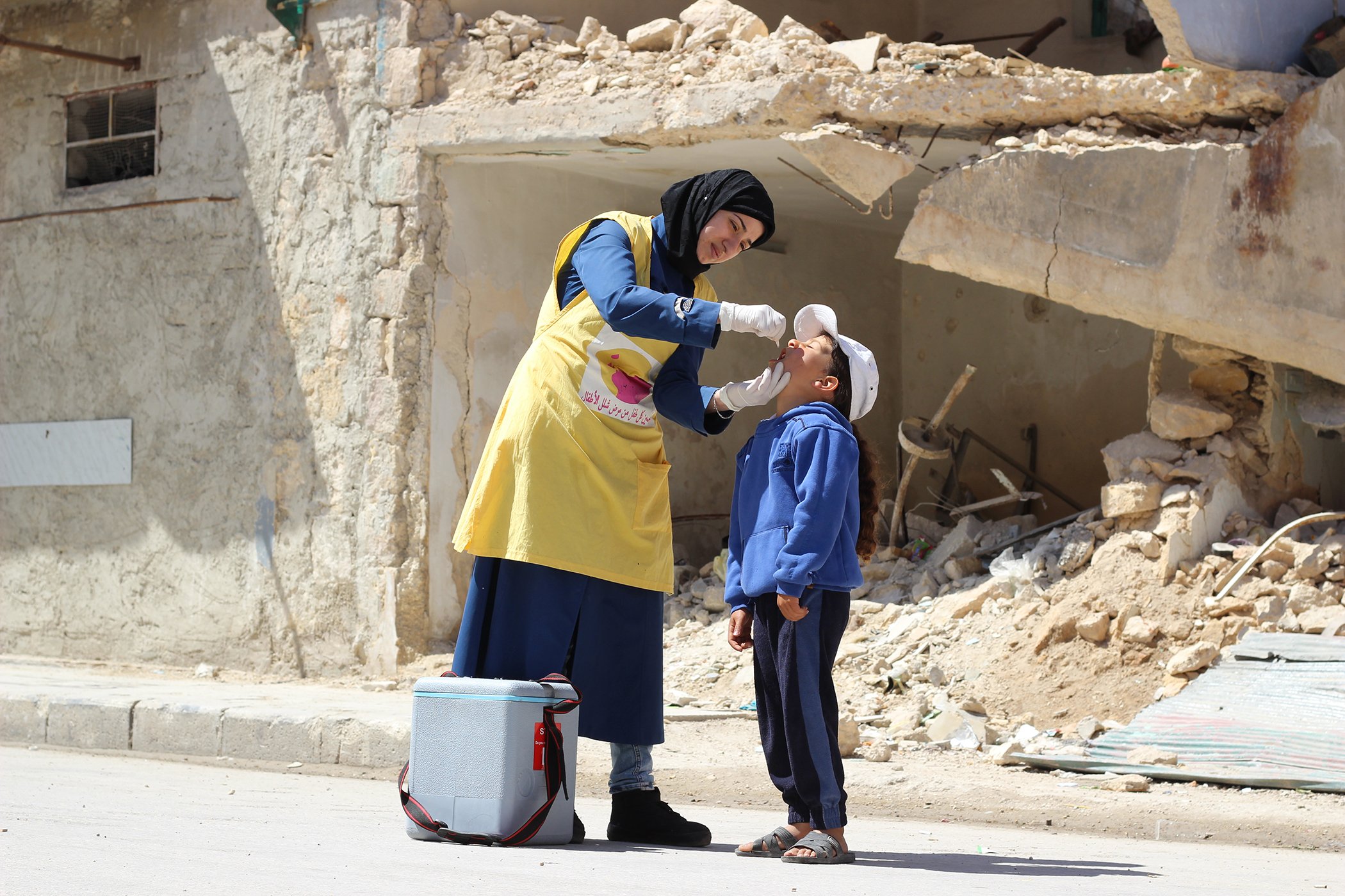 A health worker vaccinates a young child against polio in Sakhour neighborhood of Aleppo, as part of a routine immunization campaign launched during the 2017 World Immunization Week. The campaign aimed to vaccinate children under five, including those who aren’t fully immunized and the most vulnerable children living in shelters, hard-to-reach and besieged areas. After six years of war, Syria’s immunization coverage has dropped from 80 per cent pre-conflict to 41 per cent in 2015. In some of the contested areas, routine immunization has completely stopped.