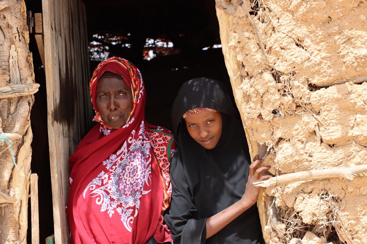 Suad*, 55, and Samia*, 12, live in an IDP camp in Somalia after leaving their home due to increasingly more frequent, severe droughts. In 2017, Suad* had 400 cows and goats, but a drought left her with only two animals. Over the following years, she was able to recover some of her livestock. The most recent drought, however, left her with almost nothing.