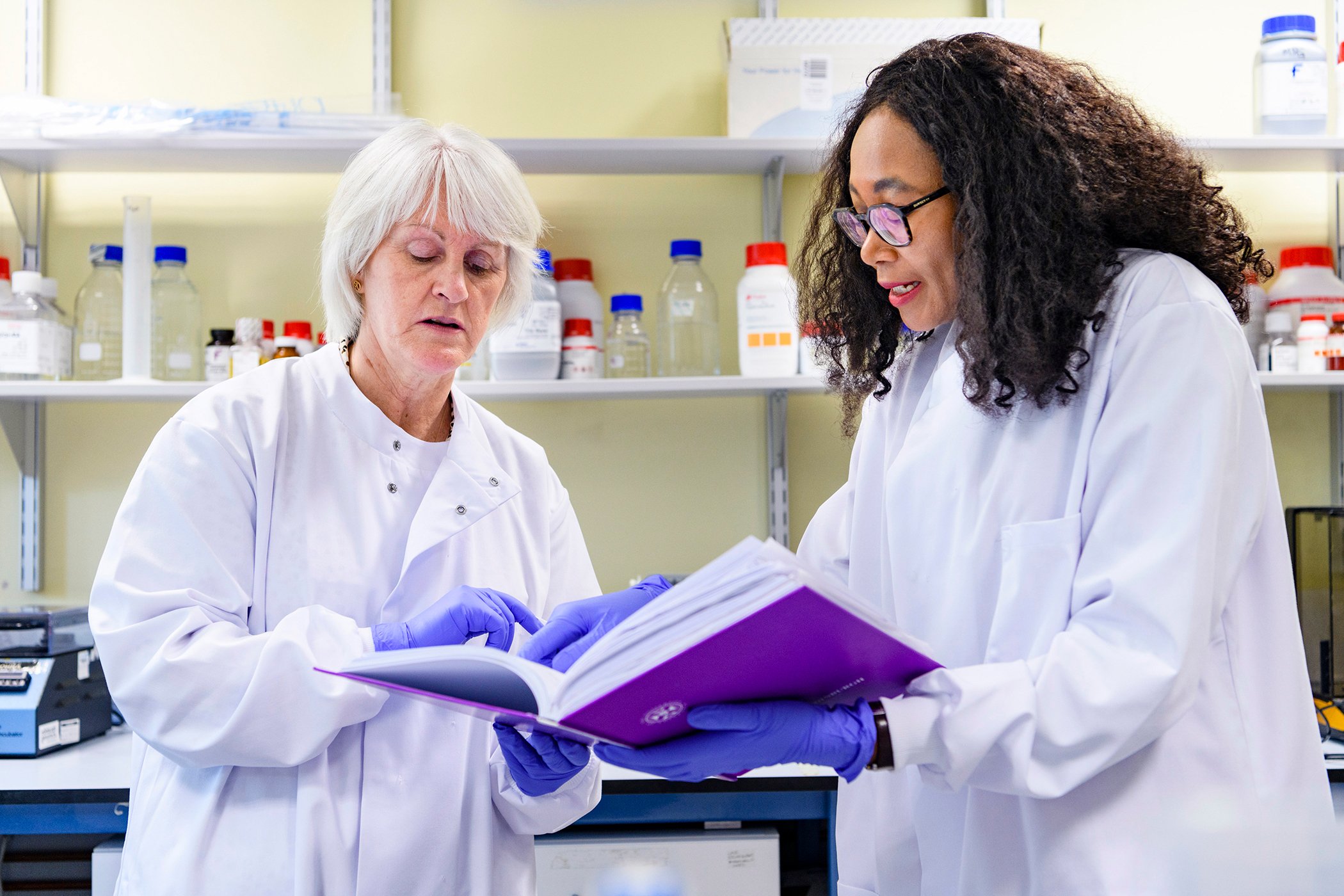 Francisca Mutapi s'entretient avec Fiona Scott, responsable des boursiers de la TIBA, dans les laboratoires Ashworth du campus King's Buildings de l'université d'Édimbourg, le 19 mai 2021.