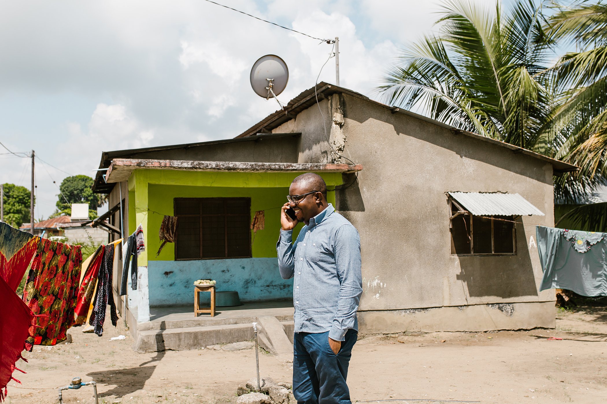 Dr. Joachim Mabula uses his telephone outside of his home in Tanga, Tanzania on Dec. 5, 2020.