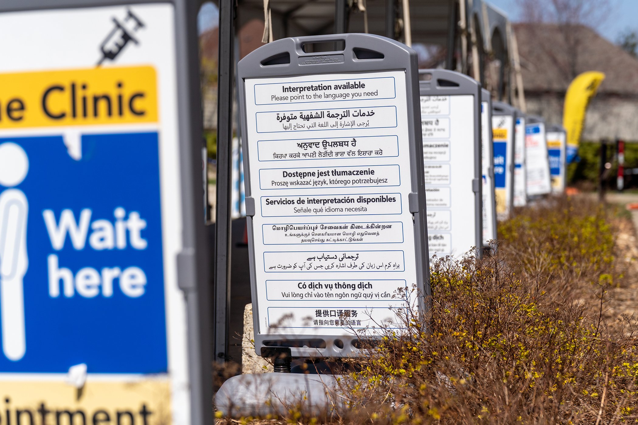 Des panneaux publicitaires sur la COVID-19 sont affichés en plusieurs langues à l'extérieur du site de vaccination du Brampton Soccer Centre à Brampton, en Ontario, le 23 avril 2021.