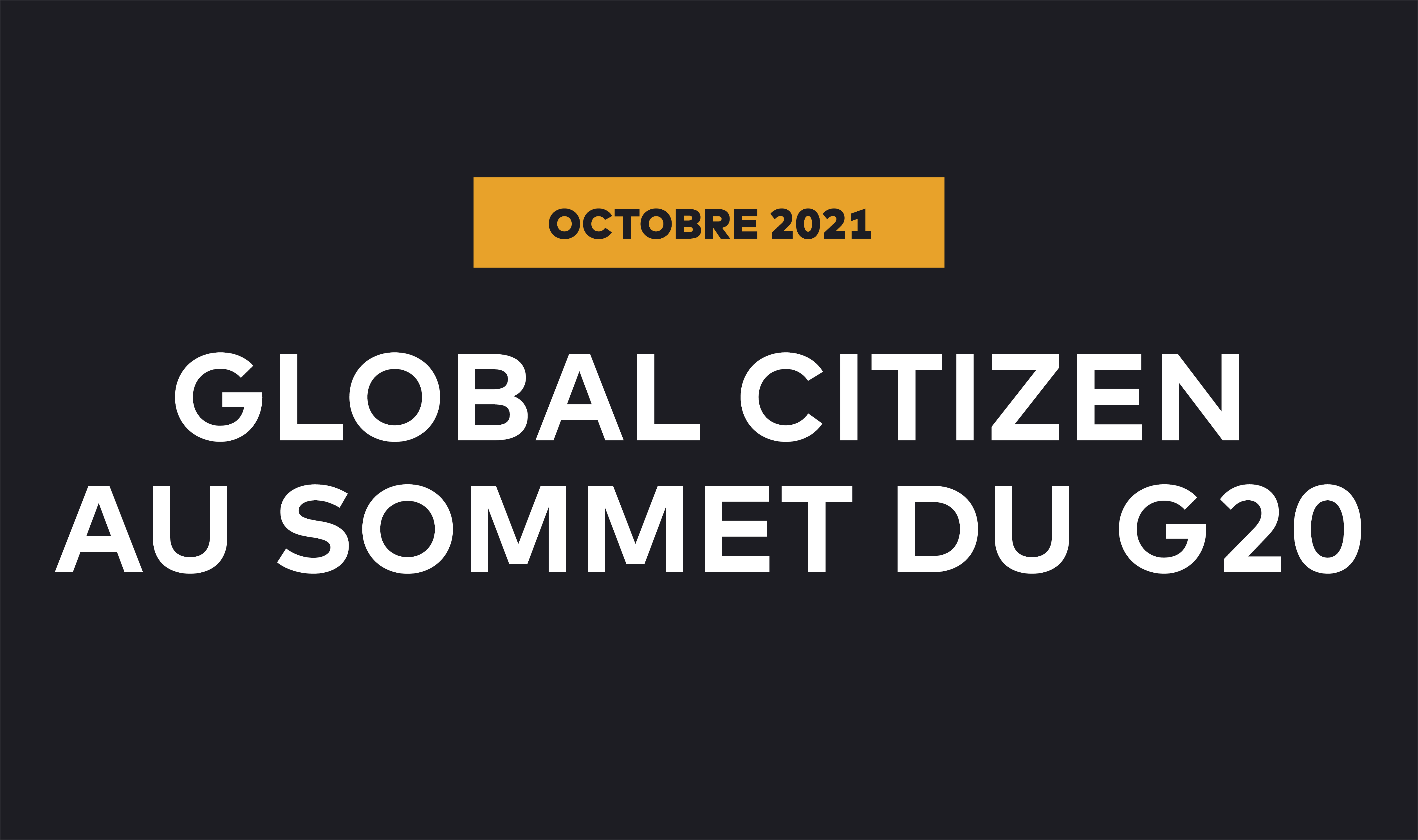 Global Citizen au sommet du G20, un événement mondial organisé conjointement par la présidence italienne du G20 et la Commission européenne, réunira des dirigeants, des organisations et des défenseurs du monde entier pour discuter des progrès réalisés dans le cadre du Plan de relance mondial, avec un accent particulier sur le changement climatique avant la COP 26. Le sommet du G20 se tiendra à Rome, en Italie, les 30 et 31 octobre 2021. Des informations complémentaires seront publiées dans les mois à venir.