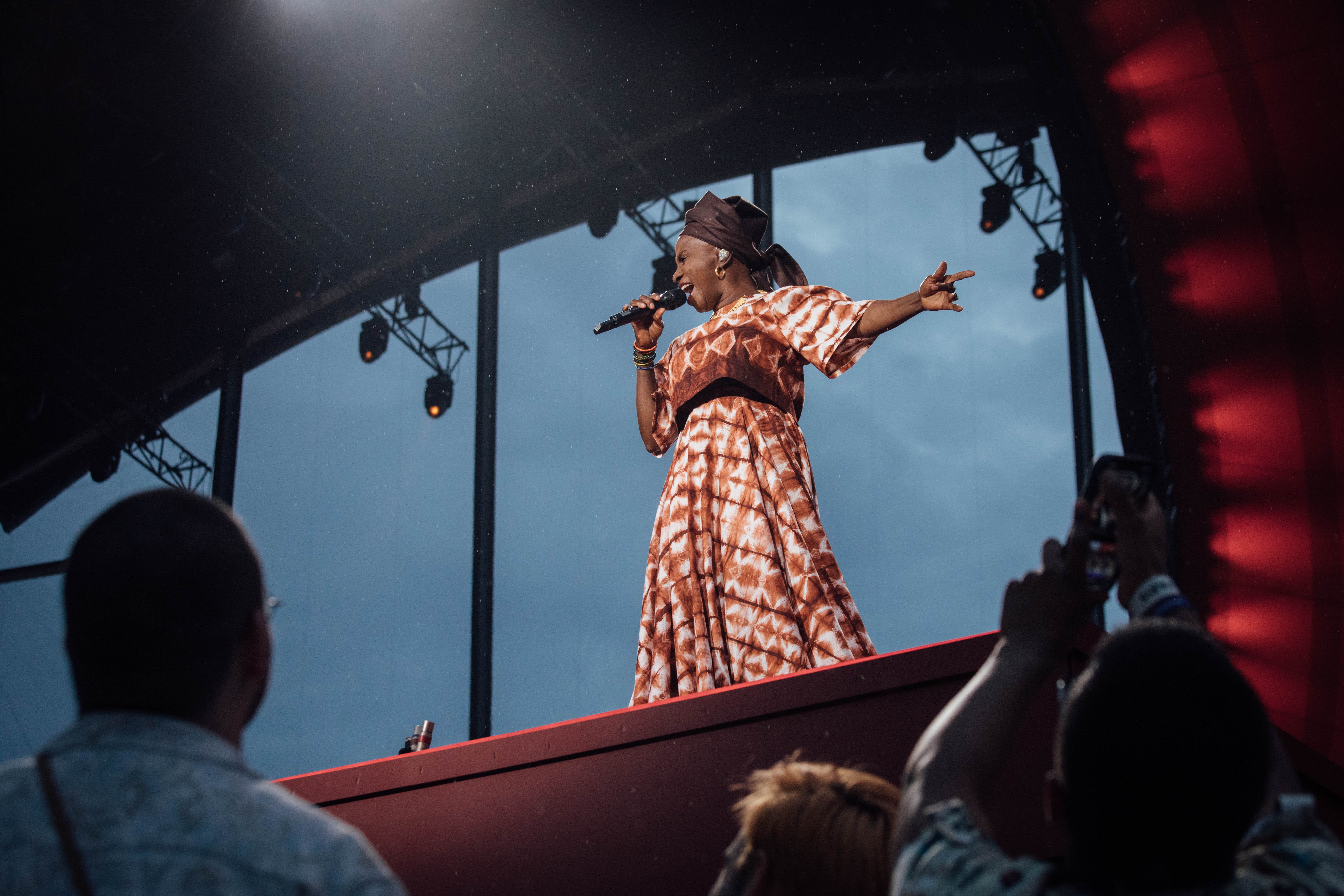 Angélique Kidjo é fotografada no palco durante o Global Citizen Live em Paris.