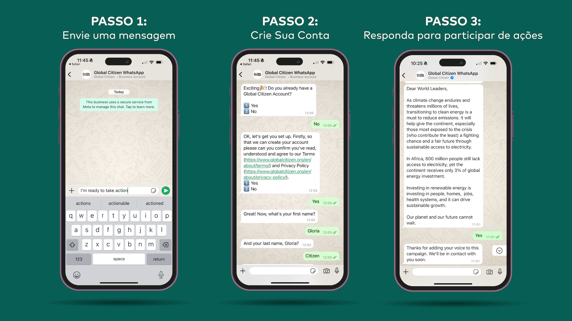 Cadastrar-se na plataforma da Global Citizen no WhatsApp leva apenas alguns cliques. Você só precisa seguir três passos: